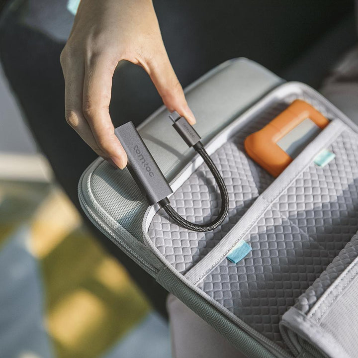 Conectorii adaptorului sunt uniți printr-un cablu cu împletitură din nylon durabilă. Aceștia sunt protejați de o carcasă din aluminiu cu suprafață anodizată, mult mai rezistentă la uzura zilnică. Finisajul se potrivește perfect cu culoarea Space Gray a MacBook-urilor. Adaptorul se poate păstra confortabil în buzunar, geantă sau rucsac, devenind un accesoriu digital esențial pentru laptop sau smartphone.