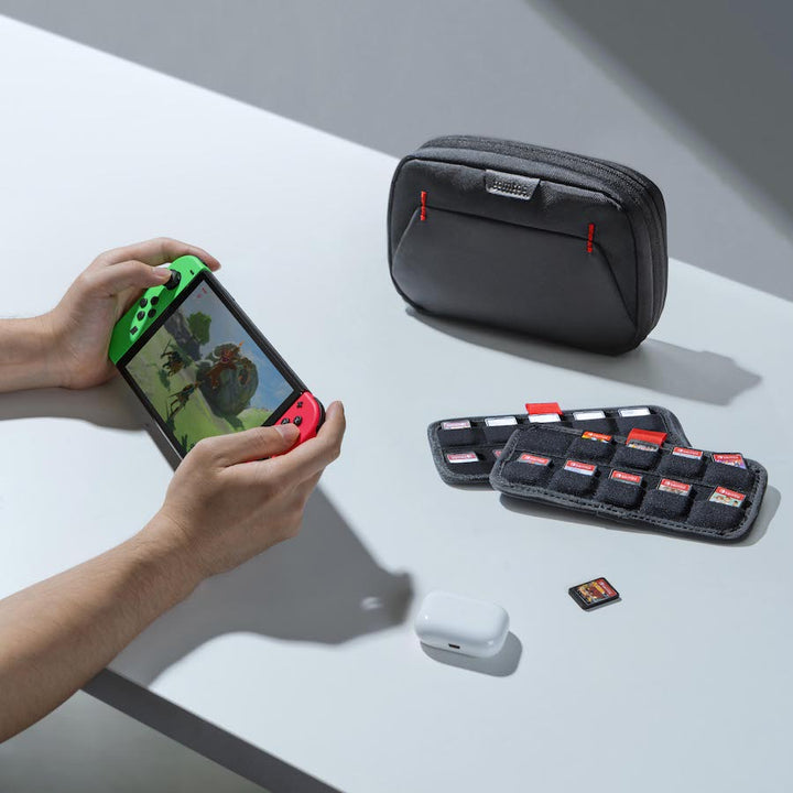 În buzunarul interior vei regăsi două tăvi detașabile pentru carduri de joc. Fiecare poate ține până la 20 de carduri, deci poți stoca până la 40 de jocuri în sloturi ordonate. Fiecare va avea locul său; vei ști unde să ajungi pentru jocul dorit și nu vei pierde niciun card. Cealaltă parte poate acomoda spațiu pentru alte accesorii Nintendo. În total, poți lua cu tine până la 80 de carduri în mișcare — perfect pentru un maraton de weekend.