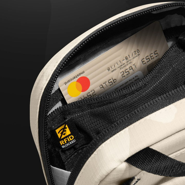 Compartimentul principal este suficient de spațios pentru a păstra în siguranță telefonul, portofelul, pașaportul, bateria externă sau documentele de călătorie. Este prevăzut cu fermoar compatibil cu lacăt (neinclus) pentru extra protecție, iar în interior găsești un buzunar cu protecție RFID, ideal pentru carduri contactless.