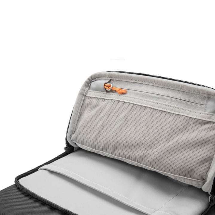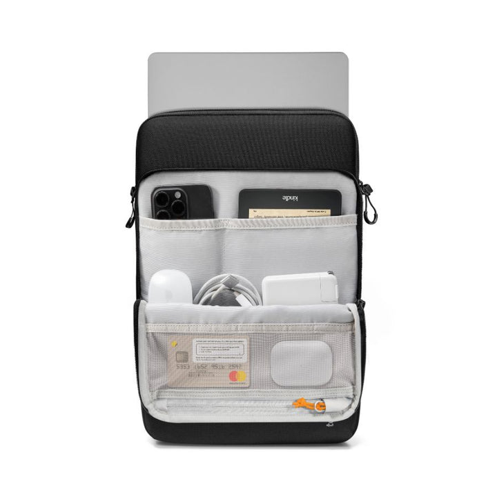 Geanta oferă claritate și confort maxim pentru utilizarea zilnică. Compartimentul principal găzduiește în siguranță MacBook-ul de 13" Air/Pro, iar buzunarul frontal, căptușit cu catifea moale, este ideal pentru iPad, electronice mici sau obiecte de birou. În interiorul acestui buzunar frontal se află un organizer inteligent cu un buzunar din plasă și două compartimente elastice, perfect pentru încărcător, cabluri, mouse sau alte accesorii. Totul rămâne organizat și protejat.