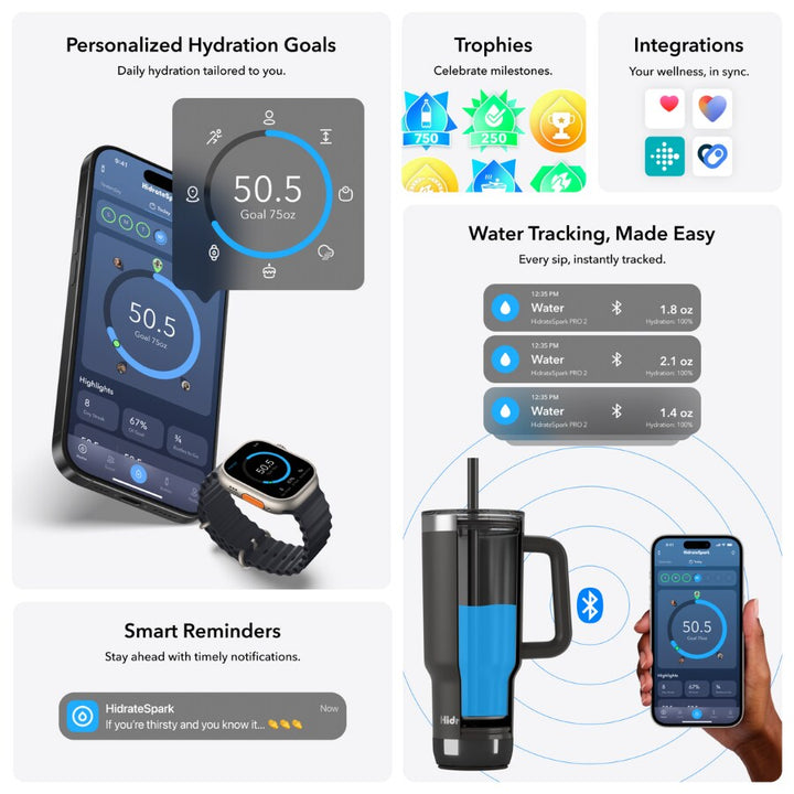Știm că hidratarea este esențială pentru sănătatea noastră, însă viața agitată ne face adesea să uităm să bem apă. La birou, în drum spre muncă sau în timpul unui program încărcat, HidrateSpark PRO 2 Tumbler Smart te ajută să-ți monitorizezi consumul de apă automat. Senzorul inteligent și alertele personalizabile prin lumini LED și sunete te atenționează când este momentul să bei. O hidratare corectă previne oboseala, durerile de cap, lipsa de concentrare și întărește sistemul imunitar.