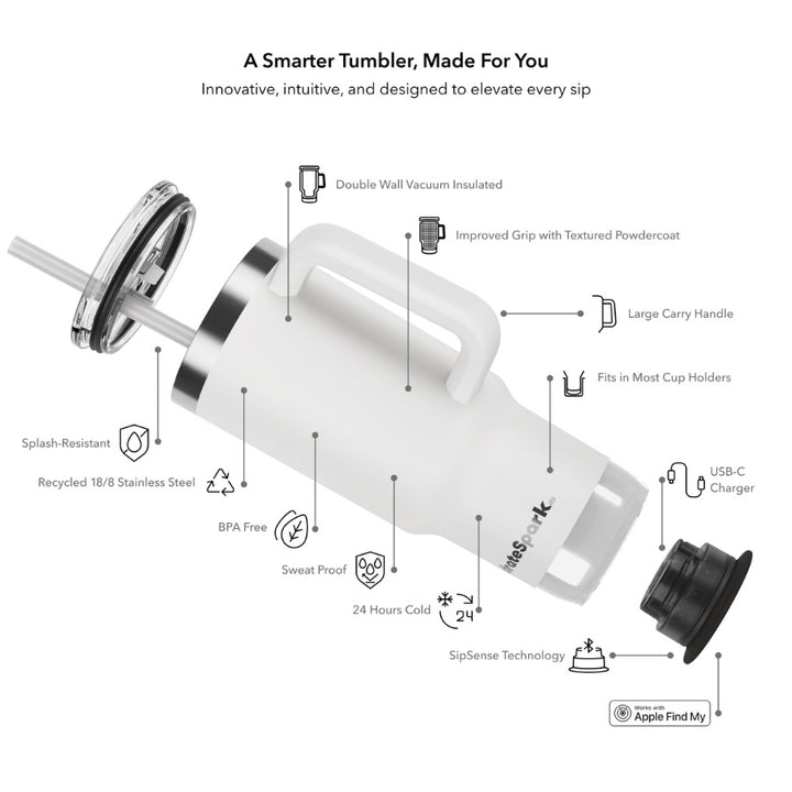 Senzorul SipSense urmărește fiecare înghițitură și sincronizează datele cu aplicația HidrateSpark. Alertele luminoase și sonore sunt complet personalizabile pentru a se potrivi stilului tău. Încărcarea se face prin USB-C, iar senzorul este compatibil între modelele PRO 2 (887 ml și 621 ml). Funcția Apple Find My permite localizarea rapidă a tumblerului dacă este pierdut. Materialele sunt sigure, fără BPA și plumb, și ușor de întreținut.