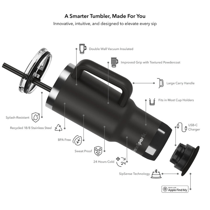 Senzorul SipSense urmărește fiecare înghițitură și sincronizează datele cu aplicația HidrateSpark. Alertele luminoase și sonore sunt complet personalizabile pentru a se potrivi stilului tău. Încărcarea se face prin USB-C, iar senzorul este compatibil între modelele PRO 2 (887 ml și 621 ml). Funcția Apple Find My permite localizarea rapidă a tumblerului dacă este pierdut. Materialele sunt sigure, fără BPA și plumb, și ușor de întreținut.