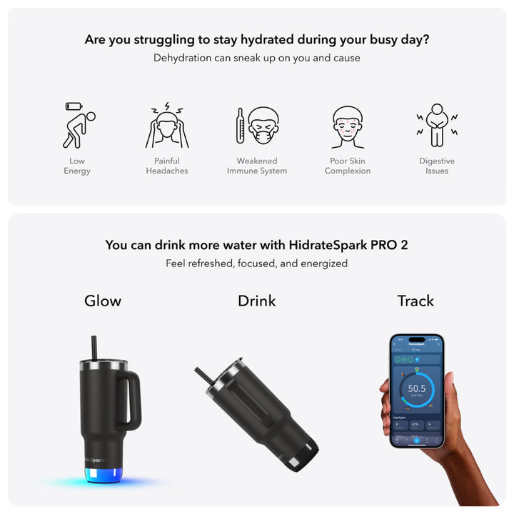 Știm că hidratarea este esențială pentru sănătatea noastră, însă viața agitată ne face adesea să uităm să bem apă. La birou, în drum spre muncă sau în timpul unui program încărcat, HidrateSpark PRO 2 Tumbler Smart te ajută să-ți monitorizezi consumul de apă automat. Senzorul inteligent și alertele personalizabile prin lumini LED și sunete te atenționează când este momentul să bei. O hidratare corectă previne oboseala, durerile de cap, lipsa de concentrare și întărește sistemul imunitar.