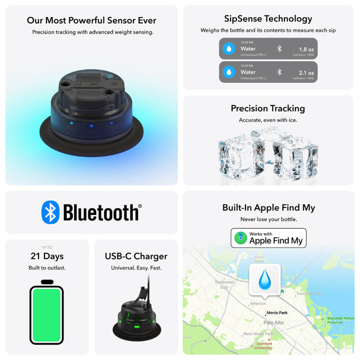 Senzorul SipSense măsoară fiecare înghițitură cu precizie și transmite datele wireless către aplicația HidrateSpark. Pe lângă lumina LED circulară, poți seta diferite semnale sonore – tonuri blânde sau melodii jucăușe – pentru a te motiva să bei la momentul potrivit. Încărcarea se face rapid prin USB-C, iar senzorul mic este compatibil între modelele PRO 2 (621 ml și 887 ml), oferind flexibilitate suplimentară. Funcția Apple Find My permite localizarea rapidă dacă sticla se pierde. Materialele sunt fără BPA și plumb, iar întreținerea este simplă.