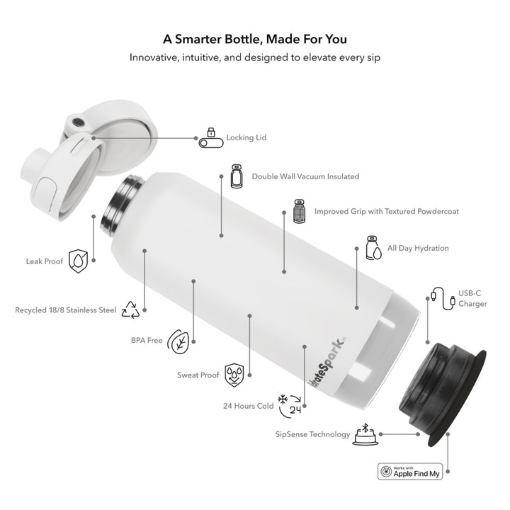 Senzorul SipSense măsoară cu precizie fiecare înghițitură și transmite datele către aplicația mobilă HidrateSpark. În plus față de lumina LED circulară care se aprinde atunci când este timpul să bei, poți seta semnale sonore personalizate – de la tonuri delicate la melodii jucăușe. Poți personaliza complet culoarea luminii, stilul efectului și tipul de alertă sonoră, conform preferințelor tale. Încărcarea senzorului se face rapid prin USB-C, iar funcția Apple Find My te ajută să localizezi sticla dacă o pierzi. Materialele sunt sigure pentru sănătate – sticla este BPA-free și fără plumb.