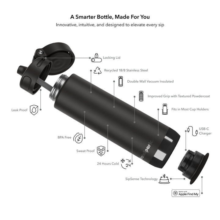 Senzorul SipSense măsoară fiecare înghițitură cu precizie și transmite datele wireless către aplicația HidrateSpark. Pe lângă lumina LED circulară, poți seta diferite semnale sonore – de la tonuri blânde la melodii jucăușe – pentru a te motiva să bei la momentul potrivit. Încărcarea se face rapid prin USB-C, iar senzorul mic este compatibil între modelele PRO 2 (621 ml și 887 ml), oferind flexibilitate suplimentară. Funcția Apple Find My permite localizarea rapidă dacă sticla se pierde. Materialele sunt fără BPA și plumb și întreținerea este ușoară.