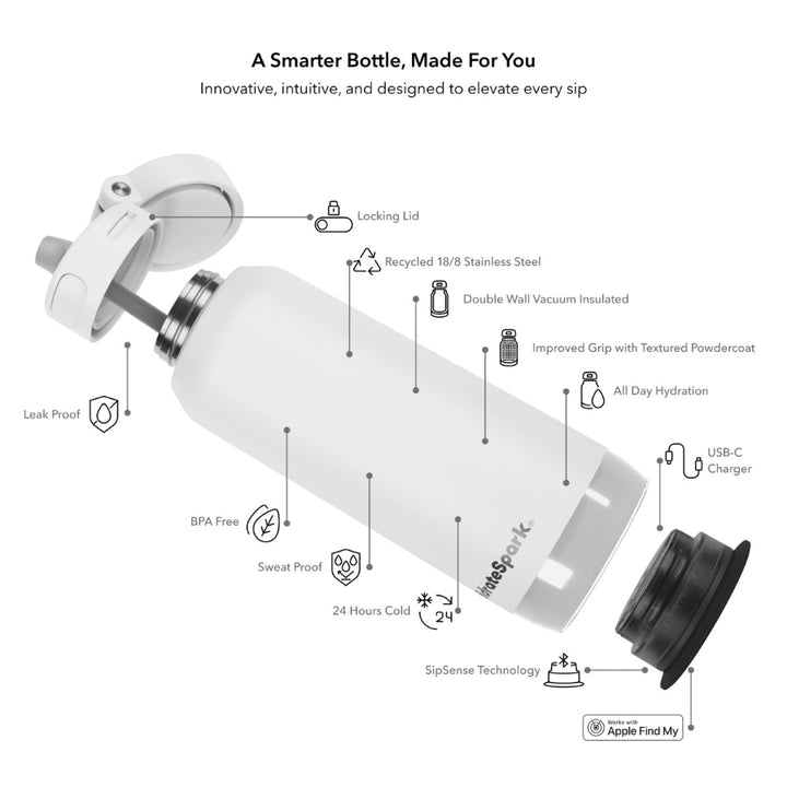Senzorul SipSense măsoară cu precizie fiecare înghițitură și transmite datele către aplicația mobilă HidrateSpark. În plus față de lumina LED circulară care se aprinde atunci când este timpul să bei, poți seta semnale sonore personalizate – de la tonuri delicate la melodii jucăușe. Poți personaliza complet culoarea luminii, stilul efectului și tipul de alertă sonoră, conform preferințelor tale. Încărcarea senzorului se face rapid prin USB-C, iar funcția Apple Find My te ajută să localizezi sticla dacă o pierzi. Materialele sunt sigure pentru sănătate – sticla este BPA-free și fără plumb.