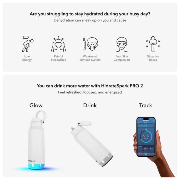 Știm cu toții că hidratarea este esențială pentru sănătatea noastră, dar în agitația zilnică este ușor să uităm să bem apă. Fie că lucrezi la birou, ești în mișcare sau ai un program aglomerat, hidratarea este adesea primul lucru neglijat. Aici intervine HidrateSpark PRO 2 – o sticlă smart care îți monitorizează aportul de apă automat. Nu mai ai nevoie de memento-uri pe telefon sau de numărat pahare – senzorul integrat urmărește câte lichide ai consumat și te atenționează cu lumini LED și alertă sonoră subtilă. O hidratare corectă previne oboseala, durerile de cap și pierderea concentrării. Cu HidrateSpark, ai suportul necesar oricând și oriunde.