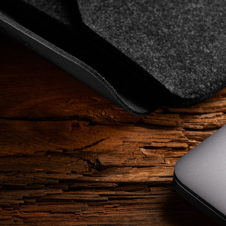 Husa este realizata din fetru de calitate si piele reala. Designul este atemporal si imbina tehnici speciale de fabricatie pentru a inmulti si trata cu uleiuri vegetale, rezultand o husa originala si personala in timp ce este folosita.