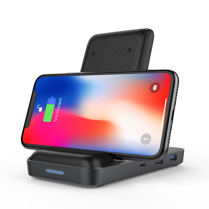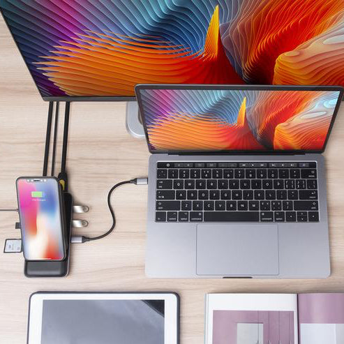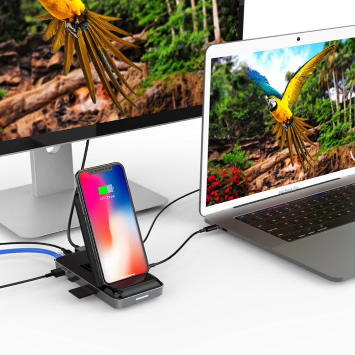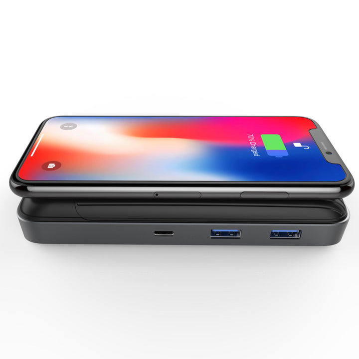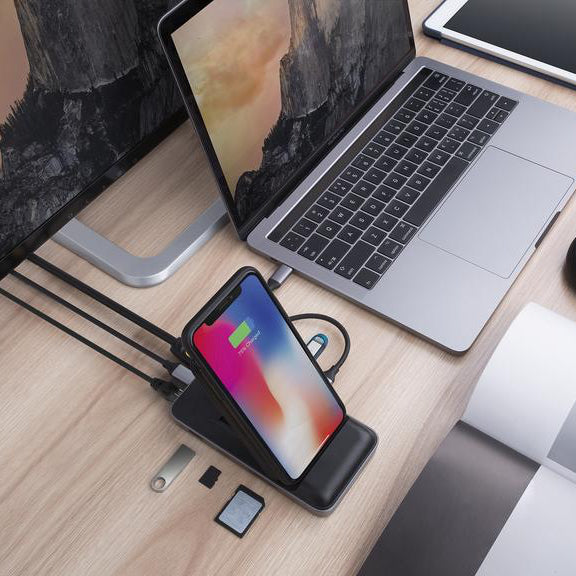 Încărcător Wireless și Hub USB-C în un singur dispozitiv? HyperDrive este creat pentru nouile iPhone-uri, cu suport pentru încărcare wireless rapidă. Acum poți ajusta suportul reglabil în mai multe poziții care corespund setărilor tale de lucru. Încărcătorul funcționează, de asemenea, ca un Hub USB-C practic 8 în 1. Conectează-l cu ușurință la MacBook Pro, pe care îl poți transforma rapid într-un spațiu de lucru.