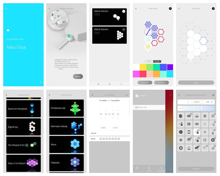 Conectează Cololight la Wi-Fi 2.4 GHz și calibrează-l folosind butonul tactil de pe spatele modulului principal. Aplicația ghidează configurarea efectelor de lumină. Iluminarea poate fi controlată și fără telefon, prin asistenți vocali, control prin sunet sau cu buton tactil fără conexiune smart.