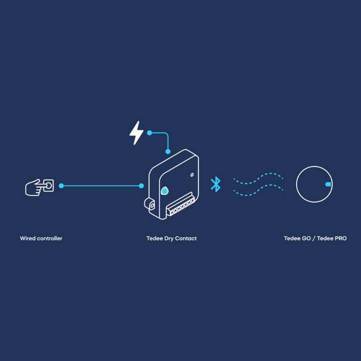 Presupuneți că doriți să deblocați o încuietoare Tedee prin apăsarea unui buton fizic dedicat la recepție pentru a permite vizitatorilor să intre în proprietate fără a utiliza aplicația Tedee pe un smartphone. Puteți conecta tedee Dry Contact la un comutator cablat, alimentat de baterie, și să îl cuplați cu încuietoarea inteligentă. Când este apăsat, acest buton activează tedee Dry Contact pentru a debloca încuietoarea prin Bluetooth, eliminând necesitatea aplicațiilor sau a unei conexiuni în cloud.