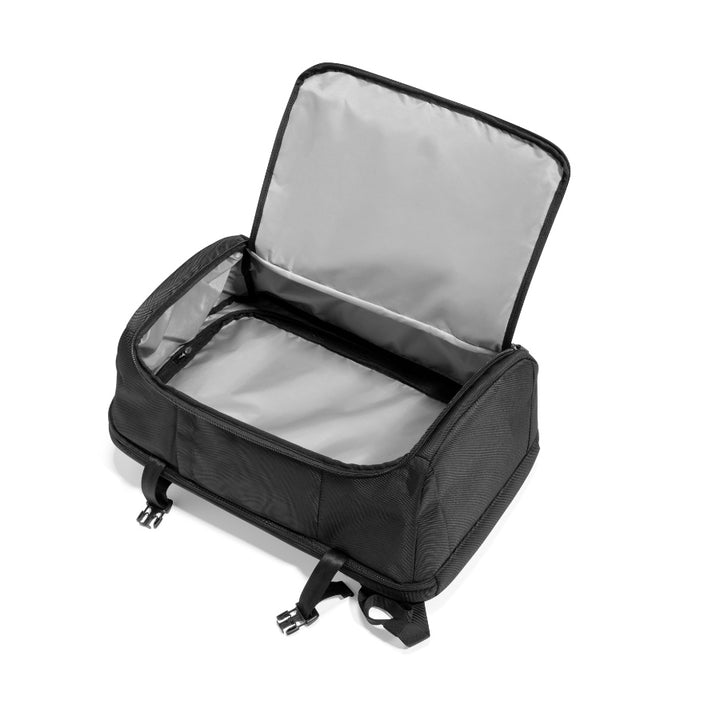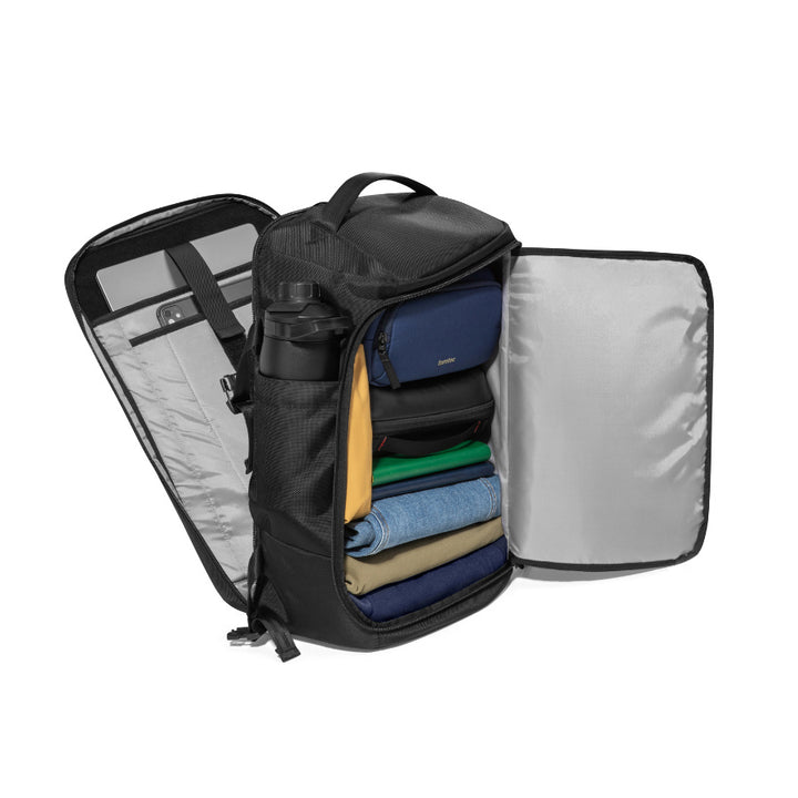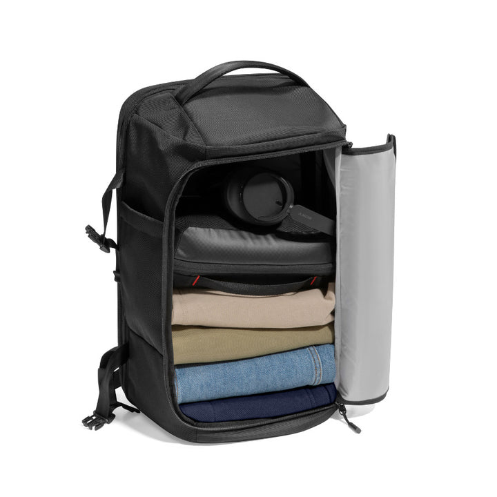 Rucsacul este împărțit în trei compartimente – principal, pentru tehnologie și frontal. Împreună sau separat, acestea oferă o organizare clară și logică. Compartimentul din spate este dedicat electronicelor, având două buzunare căptușite pentru laptop (până la 17") și tabletă (până la 13"), precum și un buzunar din plasă cu fermoar pentru încărcătoare și cabluri. Acest compartiment se deschide complet la 90°–180°, facilitând verificările de securitate în aeroport. Compartimentul principal permite acces rapid și deschidere tip clamshell, ideală pentru împachetarea structurat. Layout-ul spațios este perfect pentru haine, produse de igienă, cărți sau cameră foto. Compartimentul frontal se deschide larg și include un buzunar intern din plasă cu fermoar pentru organizarea obiectelor mici.